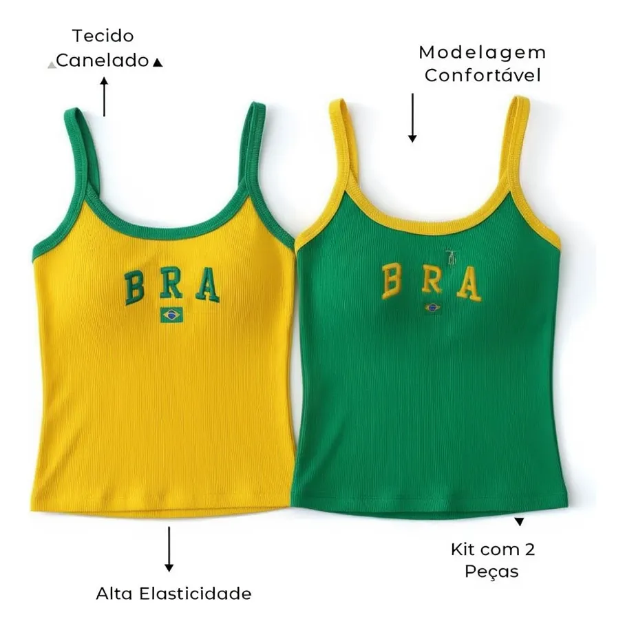 O Kit com 2 Croppeds Femininos Brasil é perfeito para quem quer montar looks modernos para torcer pela Seleção ou curtir momentos especiais com muito estilo.